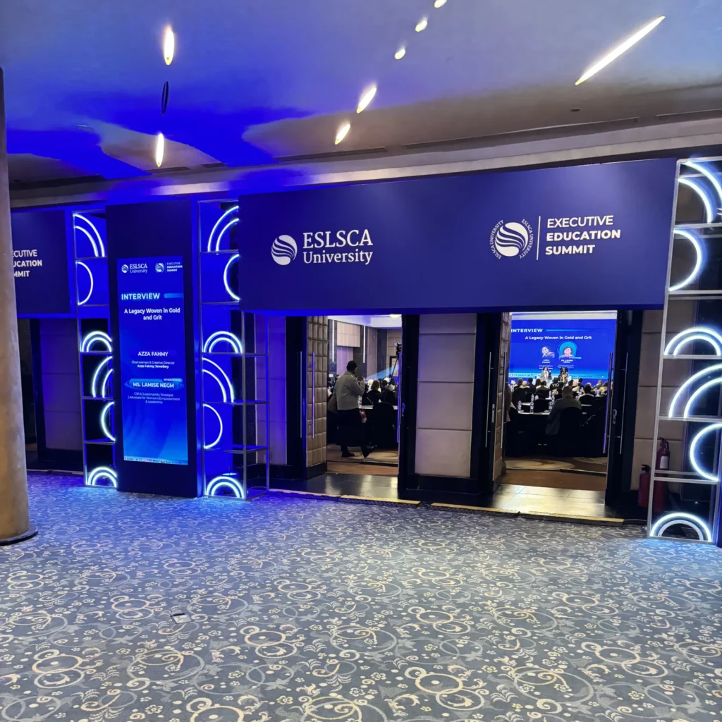 The ESLSCA Executive Education Summit was a high-profile gathering of thought leaders, industry pioneers, and academic influencers, hosted at ESLSCA University. Insite was entrusted with full event production — from concept to execution — to create an immersive environment that reflected the summit’s prestige and intellectual depth. The event featured keynote interviews, including a standout session titled “A Legacy Woven in Gold and Grit” with renowned designer Azza Fahmy and Ms. Lamise Negm, National Coordinator of the Anti-Corruption Committee. The atmosphere was elevated with dynamic lighting, branded installations, and seamless AV integration, ensuring every moment resonated with professionalism and impact. The summit welcomed a curated audience of executives, scholars, and media, offering a platform for meaningful dialogue and brand positioning.